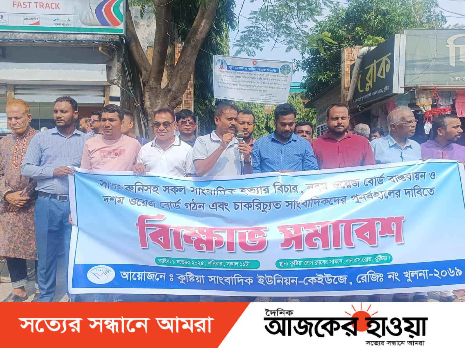 কুষ্টিয়ায় সাংবাদিক ইউনিয়নের উদ্যোগে সাগর-রুনিসহ সকল সাংবাদিক হত্যার বিচার, নবম ওয়েজ বোর্ড বাস্তবায়ন ও দশম ওয়েজ বোর্ড গঠন এবং চাকরিচ্যূত সাংবাদিকদের পূণর্বহালের দাবিতে মানববন্ধন ও বিক্ষোভ সমাবেশ অনুষ্ঠিত হয়েছে।